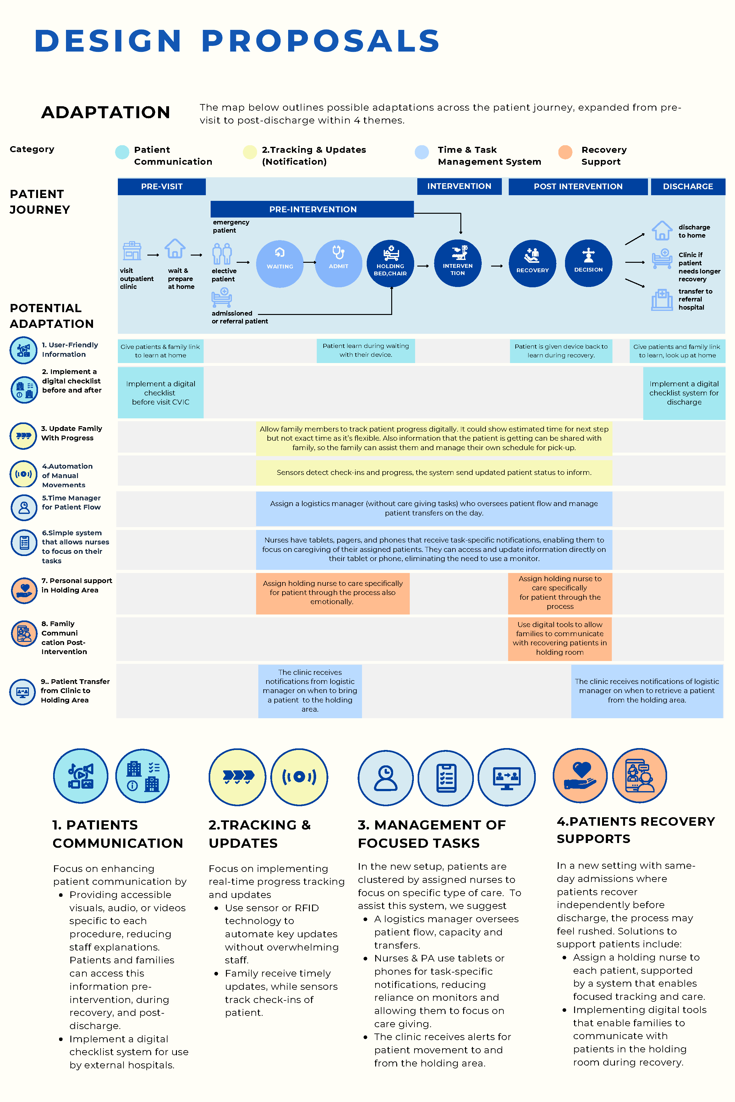 Limitation: Concepts were validated through stakeholder review with clinical staff and a patient engagement workshop. Direct observation was limited to the admission phase. These were design recommendations for the CVIC expansion, not a shipped system.